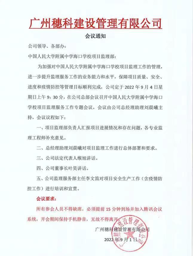 關于召開中國人民大學附屬中學海口學校項目監(jiān)理服務工作專題會議通知